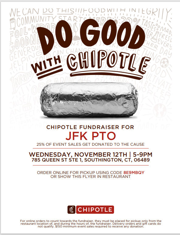 Support JFK by dining in or out at Chipotle on Wednesday, November 12th from 5-9pm. Details below.